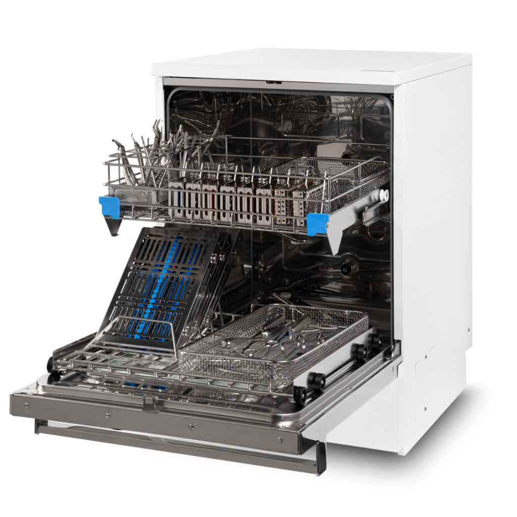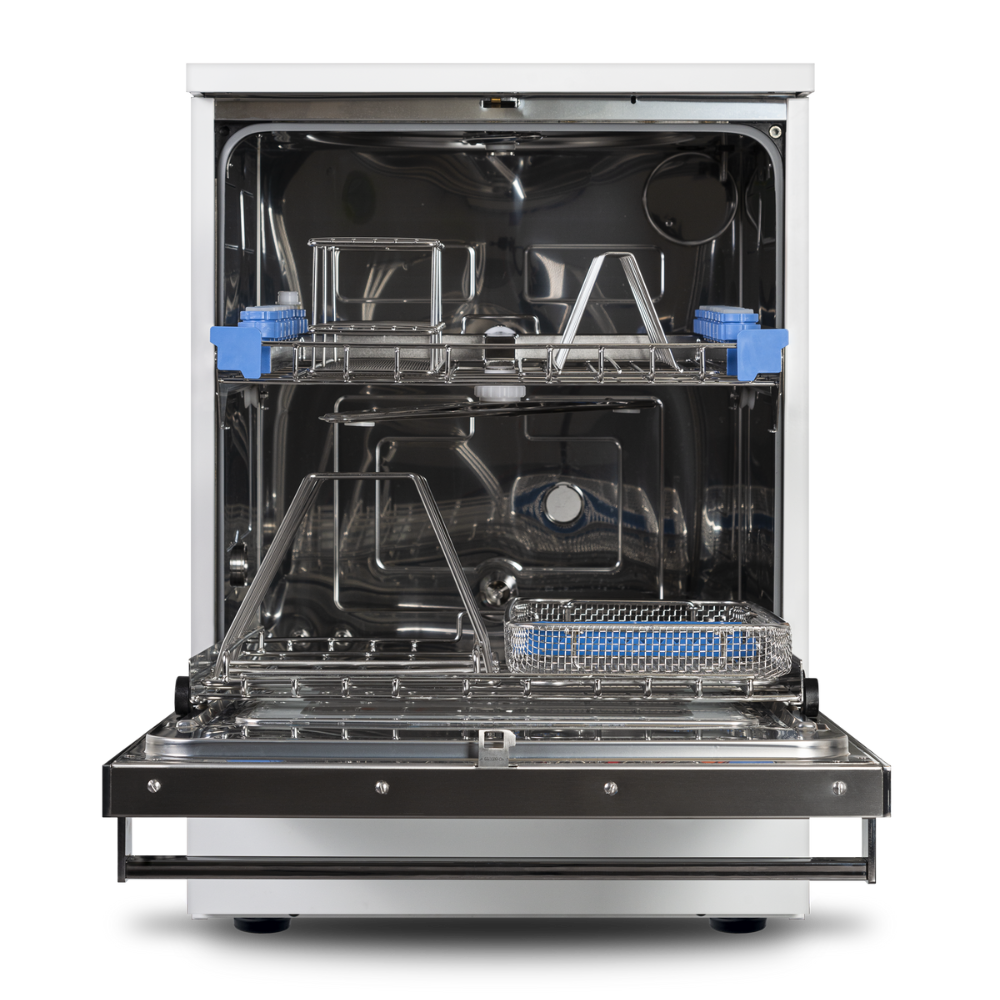 Gracias a la cámara de lavado de 170 litros, puede alojar hasta 4 cargas completas de un autoclave de 24 litros, lo que equivale a más de 140 piezas de instrumental más turbinas, puntas de eliminadores de sarro y fresas.