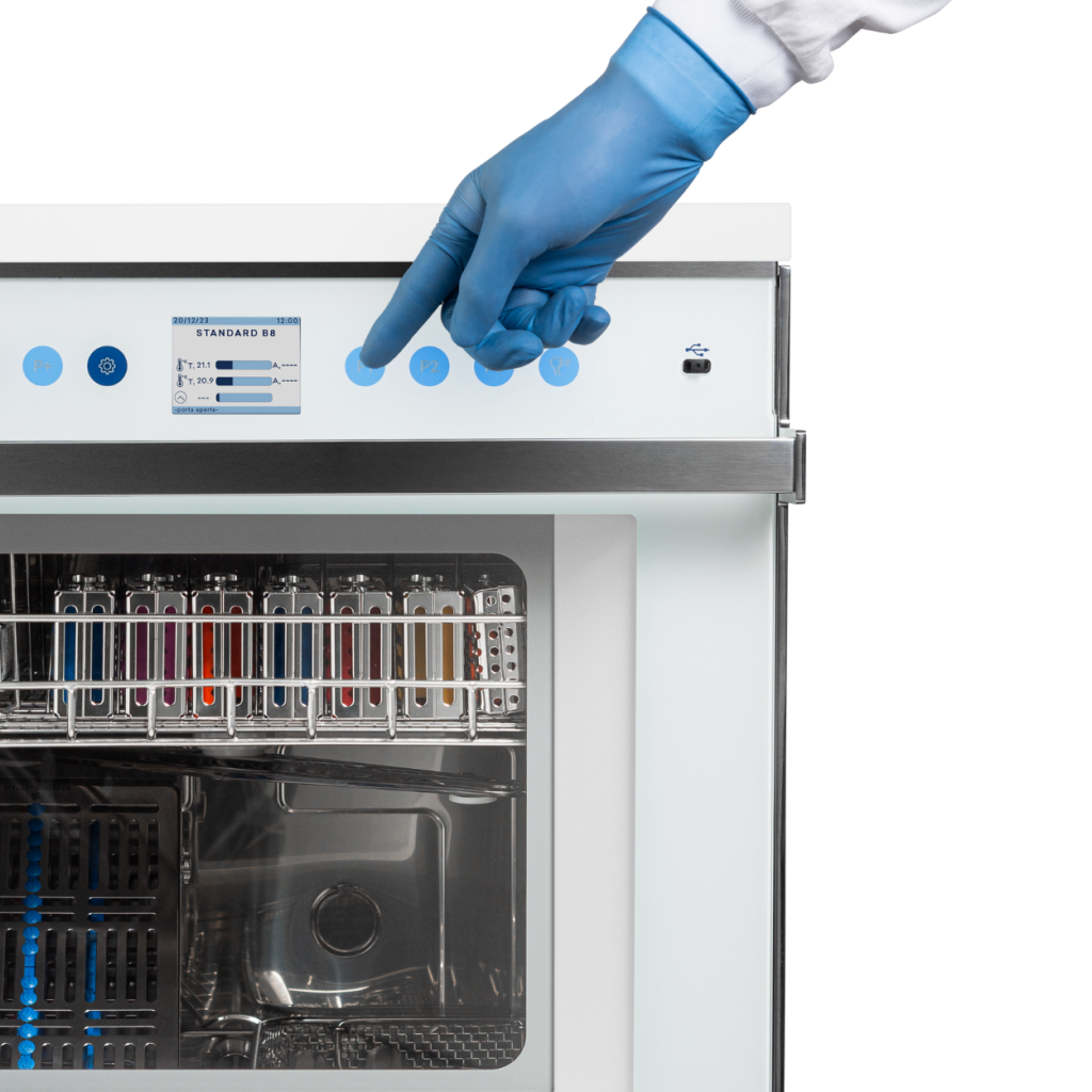 Garantiza un valor A0 mínimo de 600 por cada ciclo de termodesinfección. También se puede establecer un valor superior y muy por encima de la norma y controlar este parámetro en tiempo real a través de la pantalla.