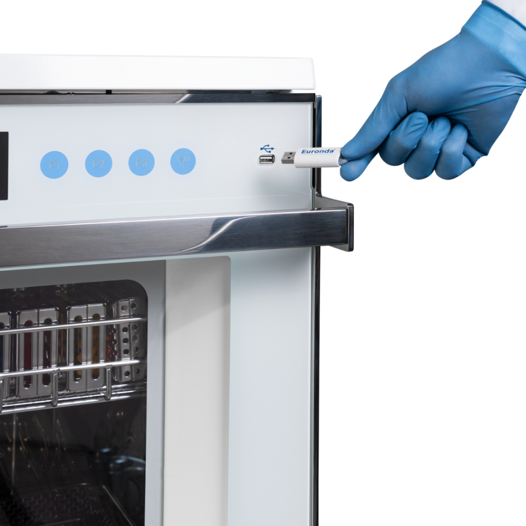 Eurosafe 170 permite realizar un seguimiento de todos los ciclos de termodesinfección realizados, guardando los datos en un dispositivo USB. Además, gracias a los accesorios opcionales, los datos se pueden transferir a un ordenador a través de la conexión Ethernet o imprimirse en papel térmico.