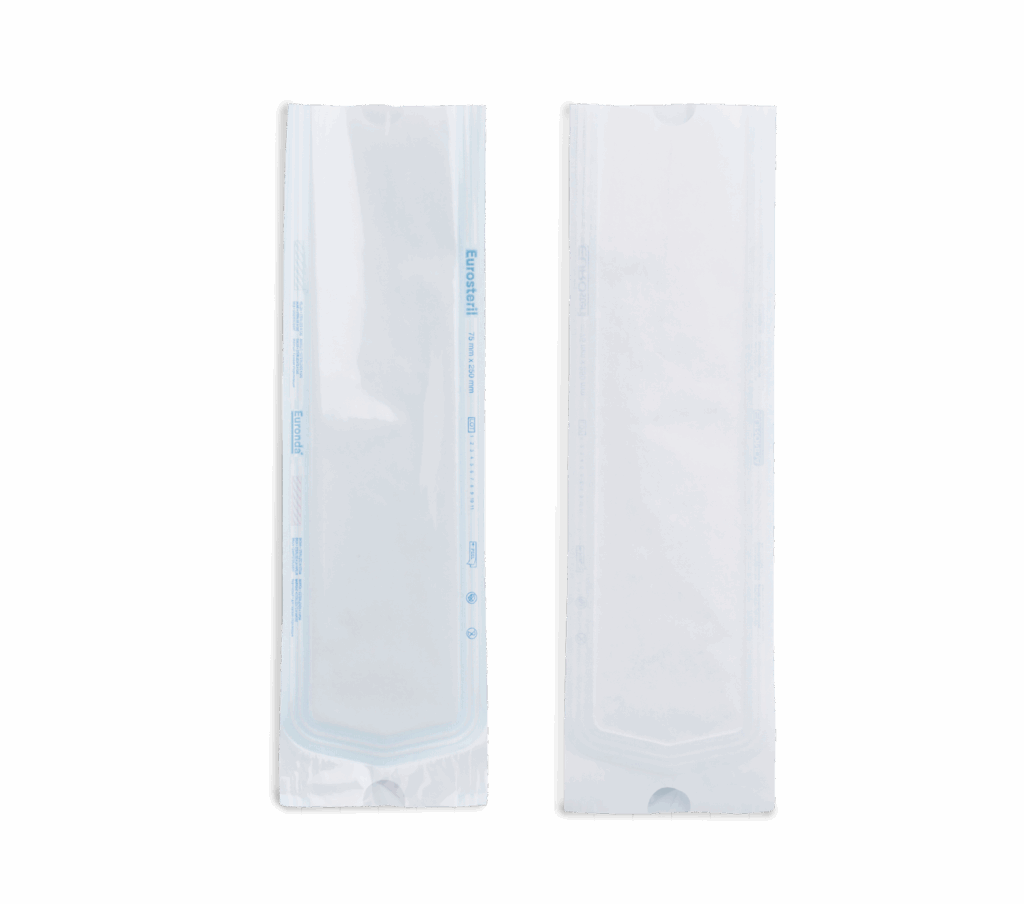 Bolsas que se pueden sellar fabricadas con papel médico blanco de alto gramaje (60g/m2) realizado con doble capa de película celeste de polietileno/ polipropileno, de conformidad con el reglamento MDR (UE) 2017/745 y la norma EN 868-5. Tres sellados laterales con canales impermeables y uniformes para garantizar la máxima protección micróbica. Equipadas con indicadores químicos de viraje para la esterilización por vapor o gas EO (óxido de etileno). Excelente pelabilidad sin que se desprendan fibras del papel o se produzcan roturas de la película cuando se abre el envase.